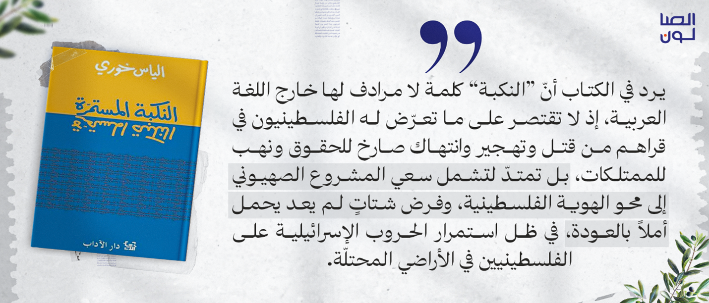 يجادل خوري في كتابه بأن "النكسة" – أو هزيمة الجيوش العربية مجددًا أمام الاحتلال الإسرائيلي في حزيران/ يونيو 1967- هي رديف للنكبة بهذا المعنى، إذ إنها ليست مجرد هزيمة عسكرية، ولا مجرّد استكمال لاحتلال "إسرائيل" لكامل أرض فلسطين إلى جانب أجزاء من أراضي دول عربية مجاورة، بل تتجاوز ذلك إلى موجات نزوح جديدة عاشها الفلسطينيون، حيث انتقل كثيرون منهم من لجوء إلى آخر. وتتجاوز ذلك، كما يرى خوري، إلى مرحلة جديدة من العدوان الإسرائيلي على الذات والهوية الفلسطينية، من خلال فرض سرديات – سواء سياسية أو أدبية – يُغيّب فيها الفلسطيني تمامًا، وكأنه لم يكن له وجود.