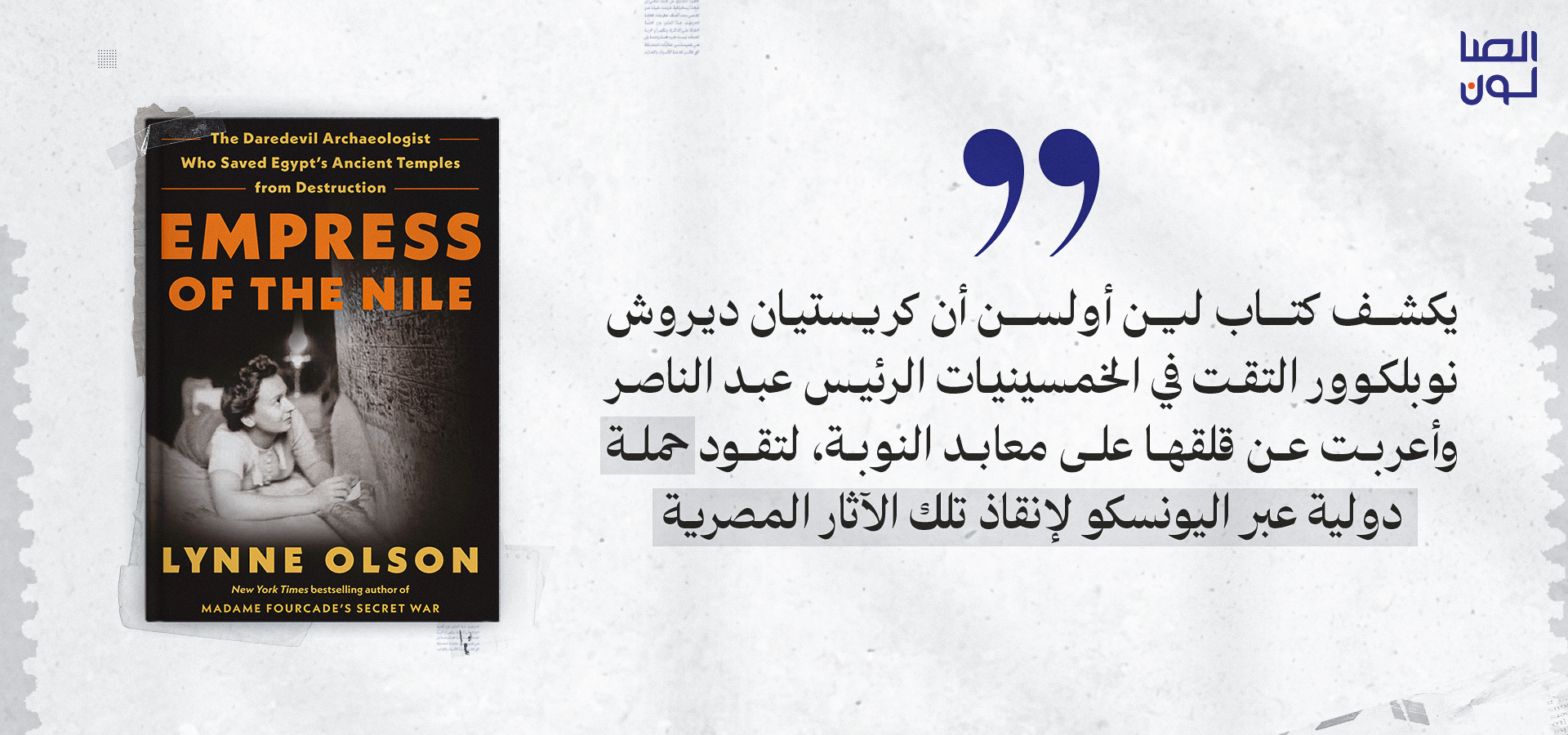 الكتاب الأخير في هذه المساحة هو كتاب أمريكي يتناول الحياة الحافلة بالتحديات والمغامرات والإنجازات لعالمة المصريات الفرنسية كريستيان ديروش نوبلكوور، التي أدّت دورًا رئيسيًا في تحريك اليونسكو والمجتمع الدولي، والتأثير في الرئيس الأمريكي جون كينيدي من أجل إنقاذ معبد أبو سمبل وآثار النوبة.