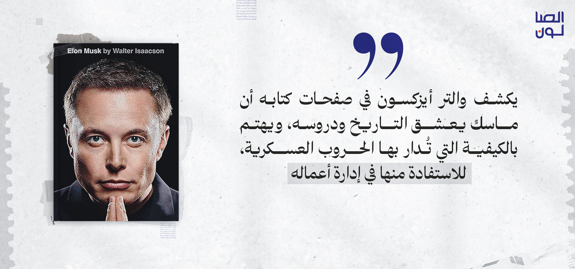 تكشف صفحات الكتاب، الصادر في 12 أيلول/ سبتمبر 2023، أن ماسك يعشق التاريخ ودروسه ويهتم بالكيفية التي تدار بها الحروب العسكرية وذلك للاستفادة منها في إدارة أعماله. كما تكشف عن اتخاذه للقائد الفرنسي الشهير نابليون بونابرت، مثلًا أعلى ومعلمًا وأستاذًا له في التفكير والتوجه وتحقيق الأحلام والطموحات. وفي سياق حديثه عن قلقه بشأن مستقبل الولايات المتحدة وتراجع برامجها العلمية والابتكارية، أشار ماسك إلى المصريين القدماء الذين أتقنوا بناء الأهرامات، ثم فُقدت تلك المعرفة لاحقًا.