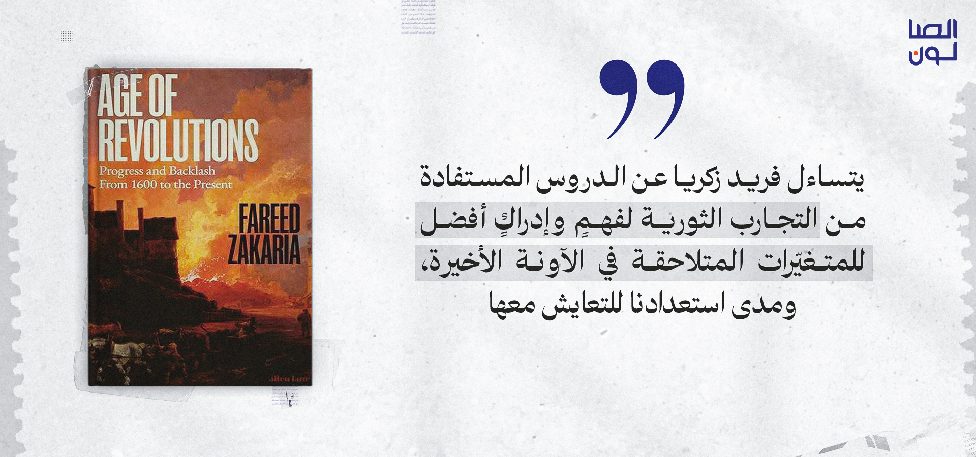 يسلّط فريد زكريا الضوء في كتابه الجديد (400 صفحة) على تاريخ الثورات العديدة التي شهدتها البشرية في القرون الماضية، وتحديدًا في أوروبا، بما في ذلك بريطانيا وفرنسا، وكيف أثّرت تلك الثورات على الأوضاع الإنسانية للشعوب التي عايشتها. كما يتساءل الكاتب عن الدروس المستفادة من تلك التجارب الثورية لفهمٍ وإدراكٍ أفضل للمتغيّرات المتلاحقة في الآونة الأخيرة، ومدى استعدادنا للتعايش معها. تلك المتغيّرات والتقلّبات التي شكّلت زمن الاستقطاب واللااستقرار الذي نعيشه اليوم، حيث ارتفعت حدّة الغضب الشعبوي والانقسام الأيديولوجي، واندلعت الصدمات الاقتصادية والتكنولوجية واشتعلت الحروب. تناول زكريا في مقال له في عدد يناير/فبراير 2024 من مجلة "فورين أفيرز" تردّد أمريكا في القيام بدورها القيادي في العالم، مشيرًا إلى أنها يجب ألّا تتخلّى عن العالم الذي صنعته ابتداءً من عام 1945.