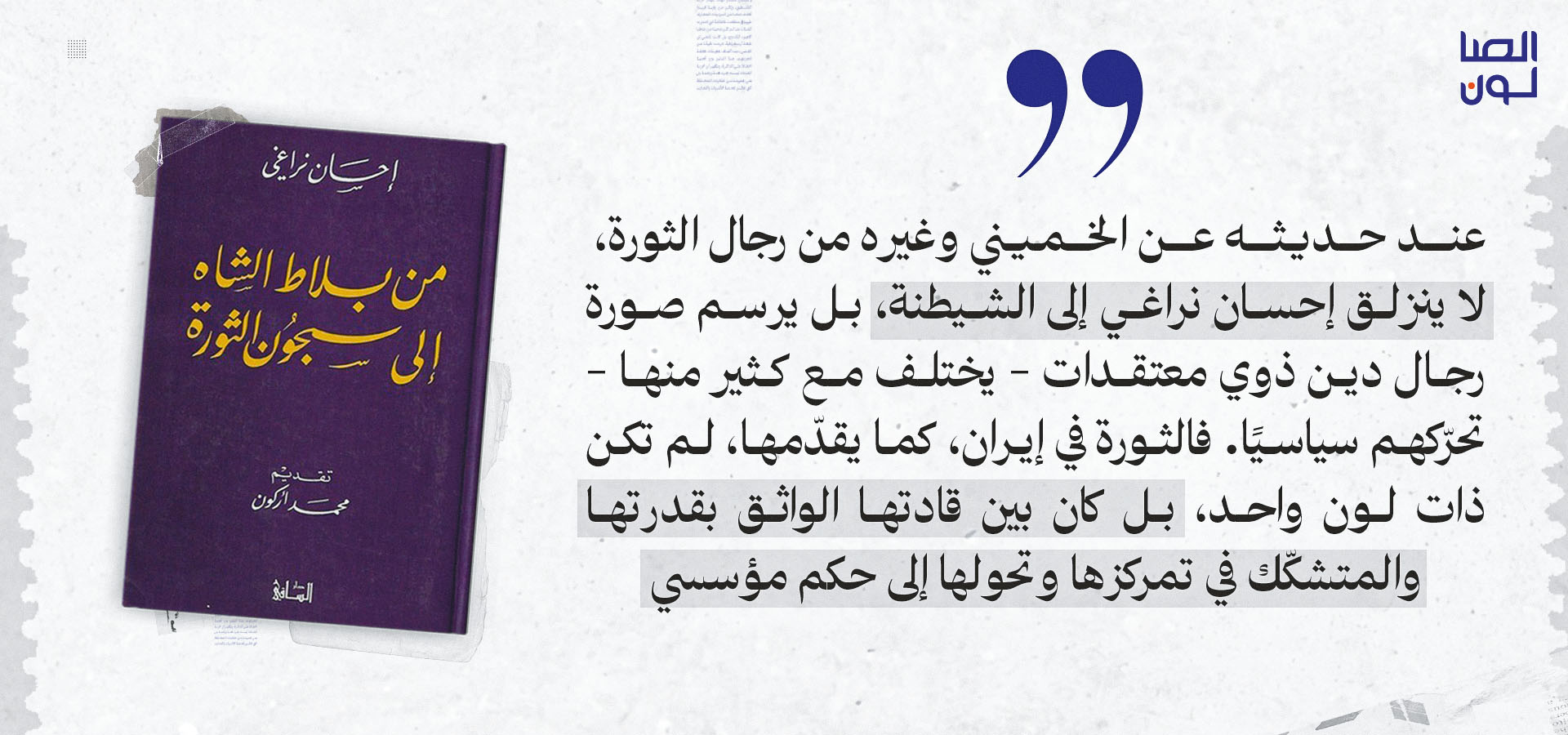 ولد إحسان نراغي، المفكّر الإيراني وعالم الاجتماع البارز، عام 1926 وتوفّي عام 2012، تاركًا للقارئ الفارسي والفرنسي مؤلفات بالغة الثراء تُرجمت إلى لغات عديدة. ومن بين ما خلّفه نراغي مذكّراته التي نُشرت بالفرنسية عام 1991 بعنوان "من بلاط الشاه إلى سجون الثورة"، وقد ترجمتها إلى العربية ماري طوق، لتصدر عن دار الساقي في طبعتها الأولى عام 1999، بعد مرور عشرين عامًا على إزاحة شاه إيران الأخير بفعل الثورة الإيرانية التي نظّر لها وقادها الإمام روح الله الخميني، من الخارج أولا ثم من الداخل.