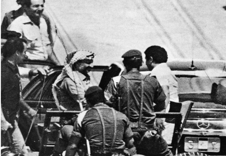 ياسر عرفات مغادراً بيروت. التقط هذه الصورة قناص من وحدة الكوماندوز التابعة لهيئة الأركان العامة للجيش الإسرائيلي، ونقلها مناحيم بيغن إلى الوسيط الأميركي فيليب حبيب لإثبات أن إسرائيل كان بوسعها قتل عرفات لو أرادت ذلك.2