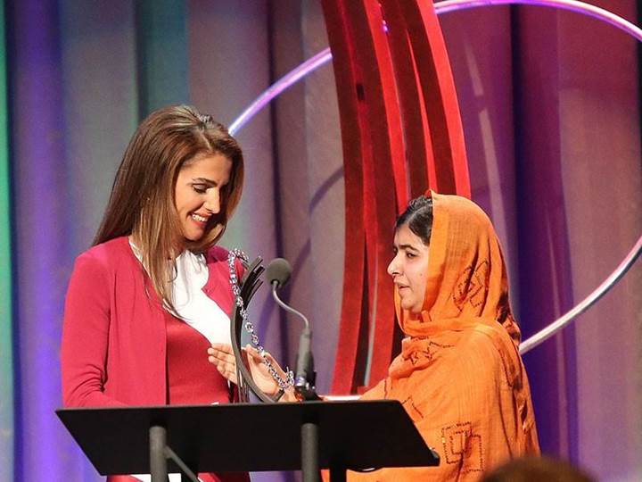 الملكة رانيا العبد الله تكرّم ملالا يوسفزي بمنحها جائزة "المواطن العالمي" عام 2013 عن فئة المجتمع المدني ضمن مبادرة كلينتون العالمية. (مصدر الصورة: الموقع الرسمي للملكة رانيا)